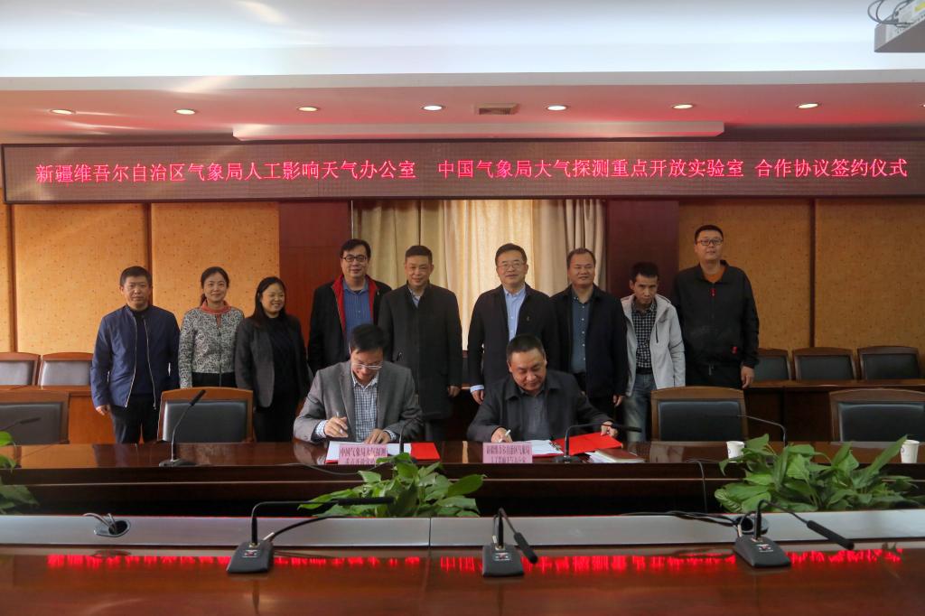11月20日下午,新疆维吾尔自治区人工影响天气办公室与学校中国气象局大气探测重点开放实验室合作协议签约仪式在行政楼七会议室举行。自治区气象局副局长何清、人工影响天气办公室主任陈胜、我校副校长范广洲参加签字仪式,会议由重点开放实验室常务副主任苏德斌教授主持。