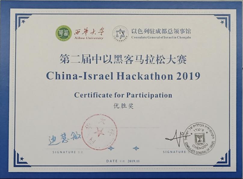 11月19日,第二届中以编程马拉松大赛暨“应急准备”中以专家圆桌论坛在西华大学举行。来自以色列本古里安大学、以色列应用科技大学、以色列赫兹利亚跨学科研究中心、Tel Hai学院13名计算机专业的学生与成都信息工程大学、西华大学、成都理工大学、成都工业学院、四川轻化工大学、宜宾学院的67名同学们联合组成16支队伍,围绕“应急准备”(Hacking the next crisis---Emergency Preparedness)主题进行编程马拉松比赛。我院刘皓然同学参加了此次大赛并以总分第5名的成绩获得优胜奖。