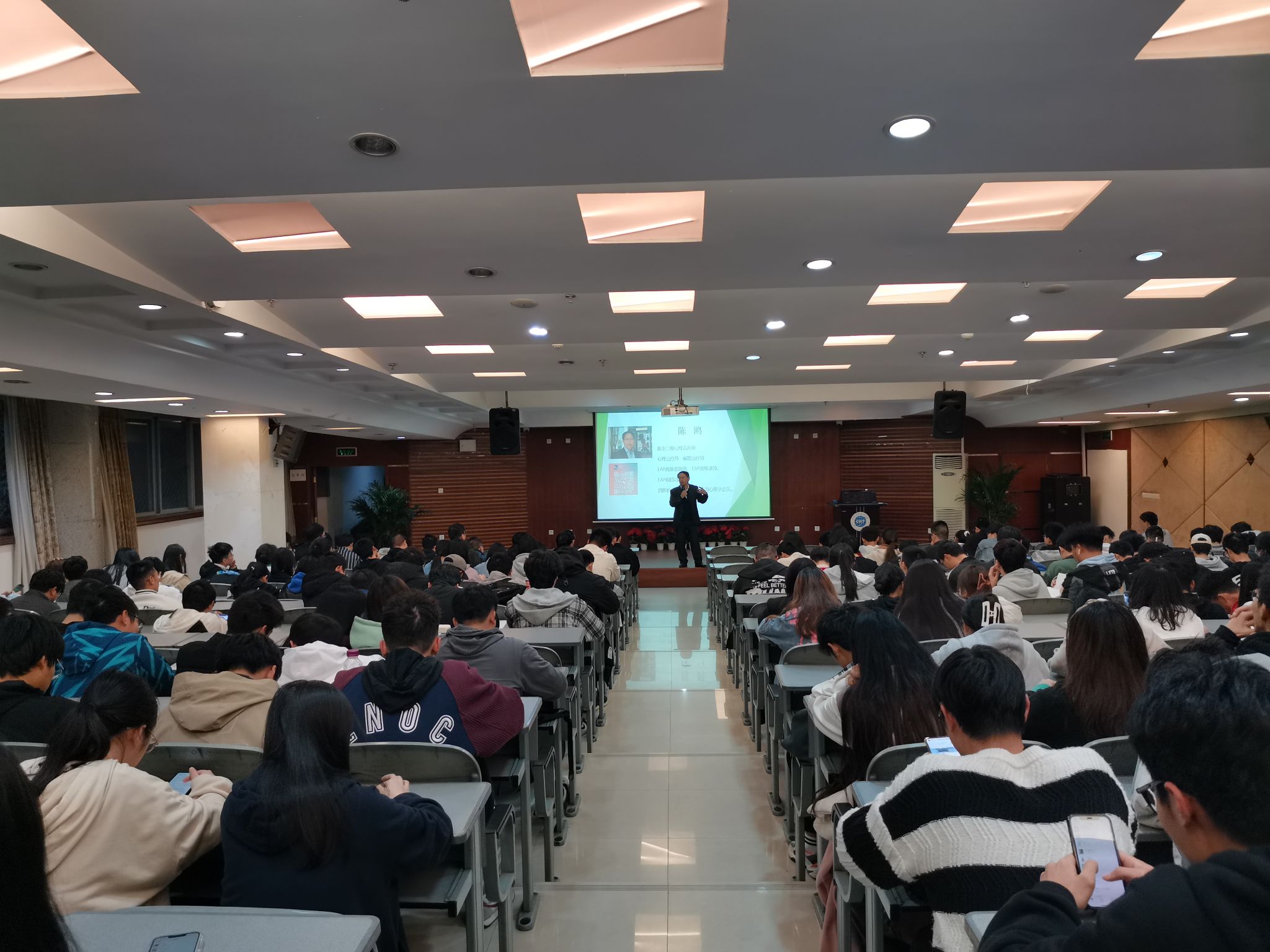 本次心理健康讲座的主讲嘉宾是知名高级心理咨询师陈鸥。在轻松愉悦的氛围中,本次讲座围绕“情绪调整与自我管理”这一主题徐徐展开。结合同学们在学习和生活中所遇到的情绪和压力问题,陈老师从情绪的来源和情绪的类别出发,在细致分析的基础上,专业而通俗地向同学们讲述了情绪的调节和情绪的管理。同时,结合不同年级同学们所关心的学业压力疏导、就业考研抉择困难、人际关系处理、负面情绪调节等心理困惑,陈老师都一一耐心讲解,细心回答。讲座环节同学们听的津津有味,互动环节同学们表现得积极踊跃,同学们有的举手提问,有的专心记录。现场时而鸦雀无声,时而欢笑不断,陈老师讲得干货满满,同学们听得受益匪浅。持续两个多小时的讲座,在现场热烈的掌声中圆满结束。