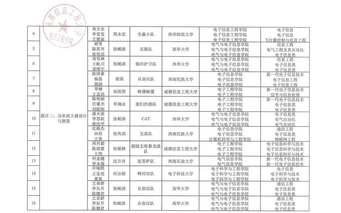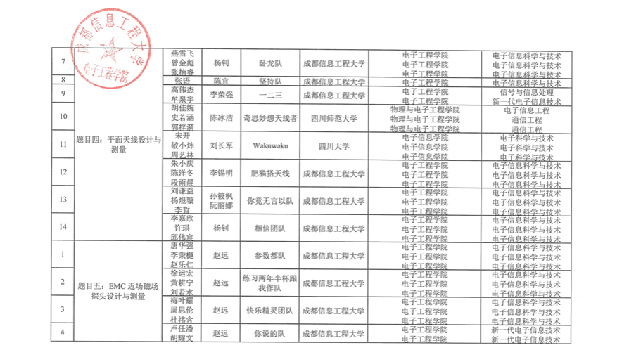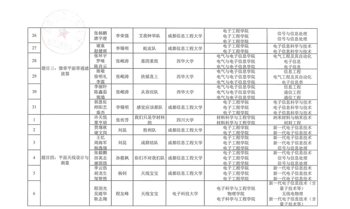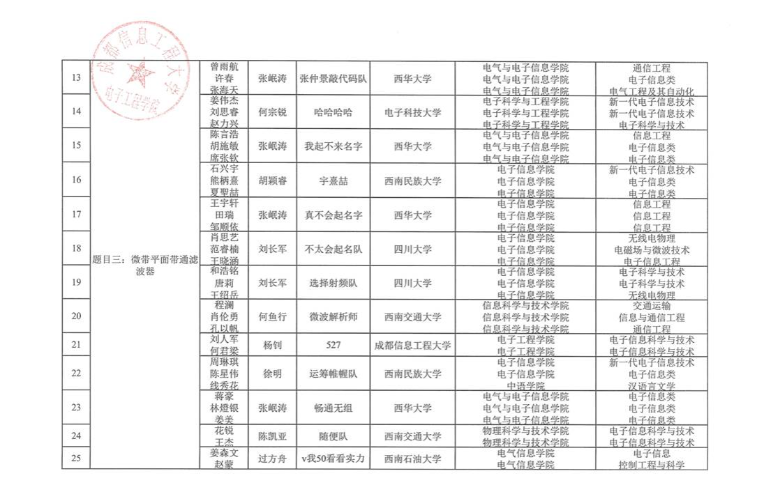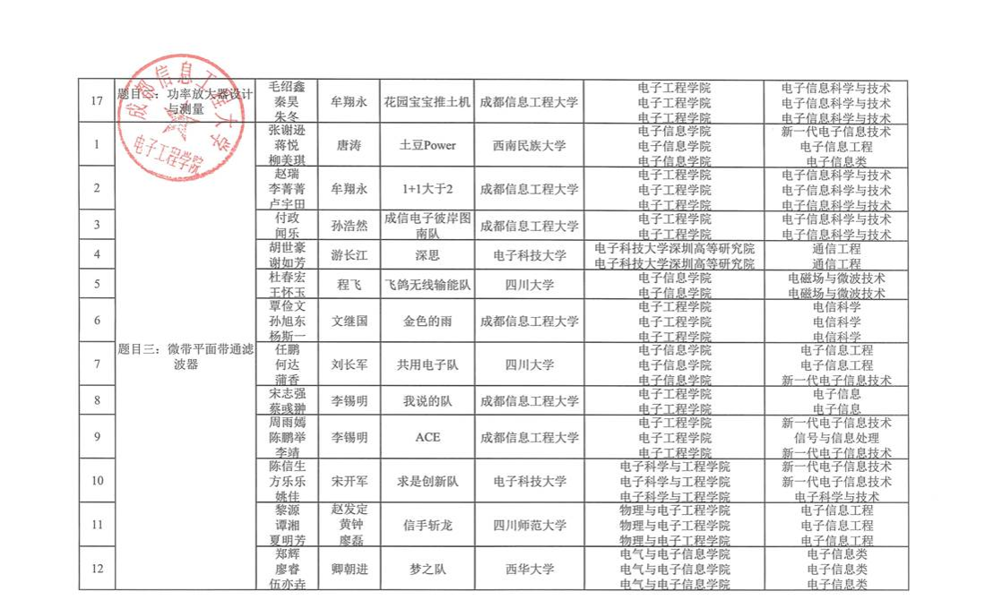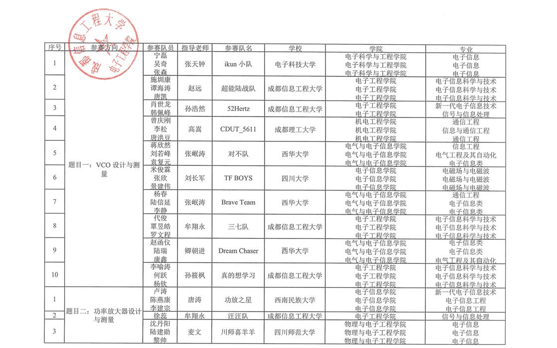 根据自愿报名的原则,四川省第一届“岷山杯”射频微波电路设计竞赛有四川大学、电子科技大学、西南交通大学、西华大学、等11所学校参与报名,合计76组队伍参赛,现予以公示,详细名单如下: