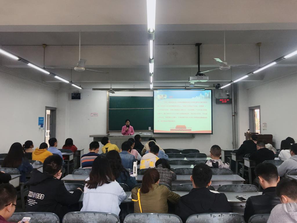 2019年11月13日中午,本科生二支部书记肖艳给学生党员上《不忘初心,肩负“四个伟大”历史使命》主题教育党课。