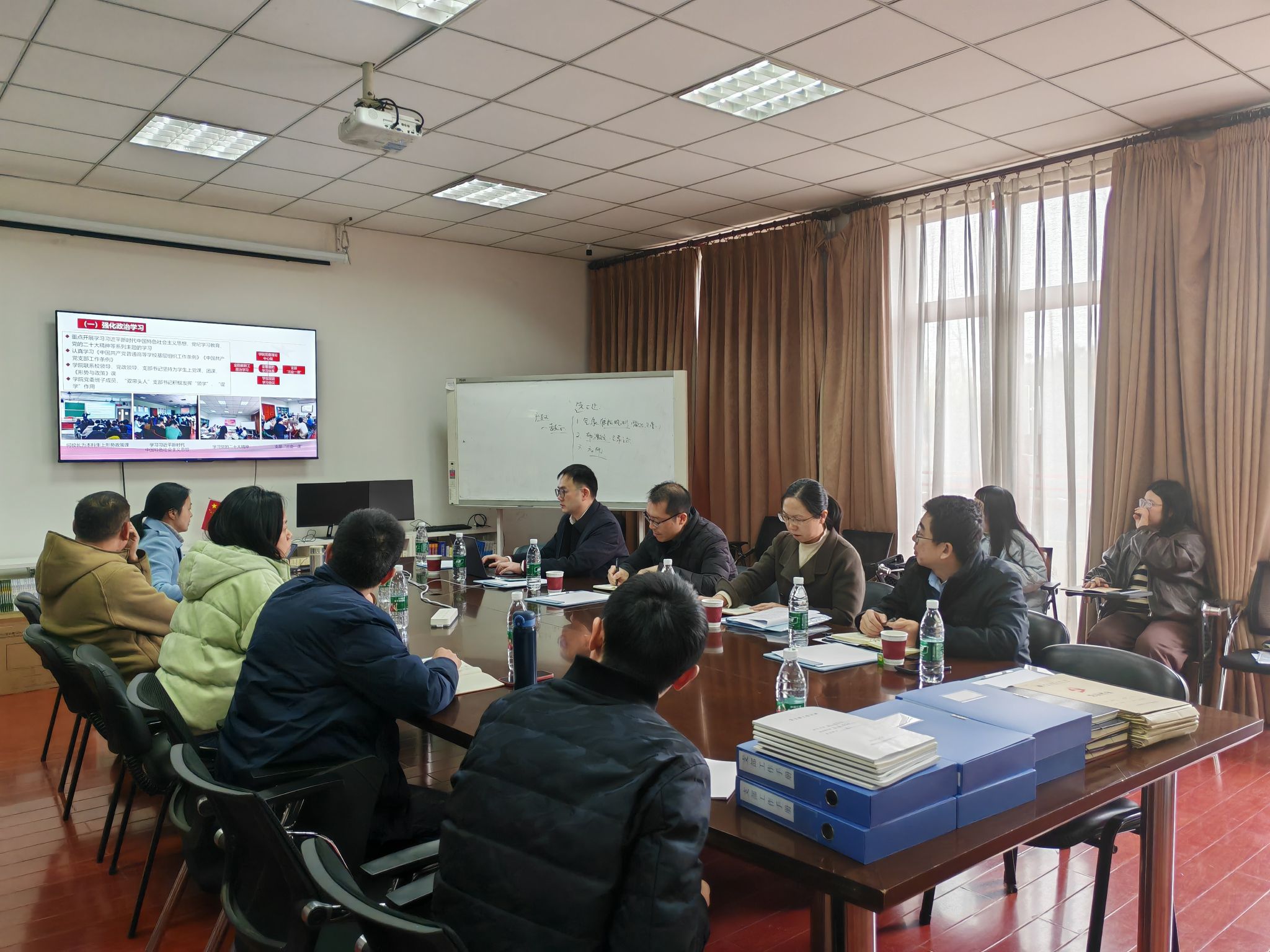 最后,党委组织部部长熊建作总结讲话,他谈到,学院党建工作要克服“做了不等于做好了”、“蜻蜓点水式学习”、“党建业务两张皮”这三种不良倾向,日常“三会一课”、“第一议题”要做到规范化、标准化,注重提升党建工作质量和实效。他肯定了学院在省级“双带头人”教工党支部书记工作室建设中做出的成效,鼓励学院继续凝练总结,做好“双带头人”党支部书记强国行项目建设工作,未来创建省级、国家级的标杆学院。