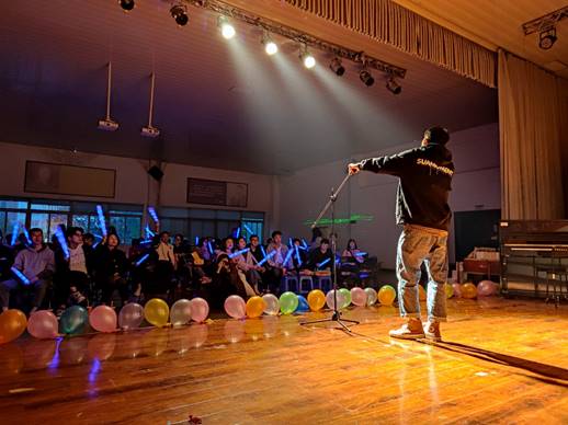 本次晚会为促进同学们之间的交流,提供一个了解认识的平台,进场前同学们被随机分成八个小组。节目与游戏相互穿插着,本次晚会设置了敲竹子、海盗船长、歌王争霸、终极密码有趣的互动小游戏,在场的同学都认真参与其中,互动频繁。最后通过同学们现场网络投票,选出大家心目中最喜欢的节目,获得“观众喜爱奖”的称号。