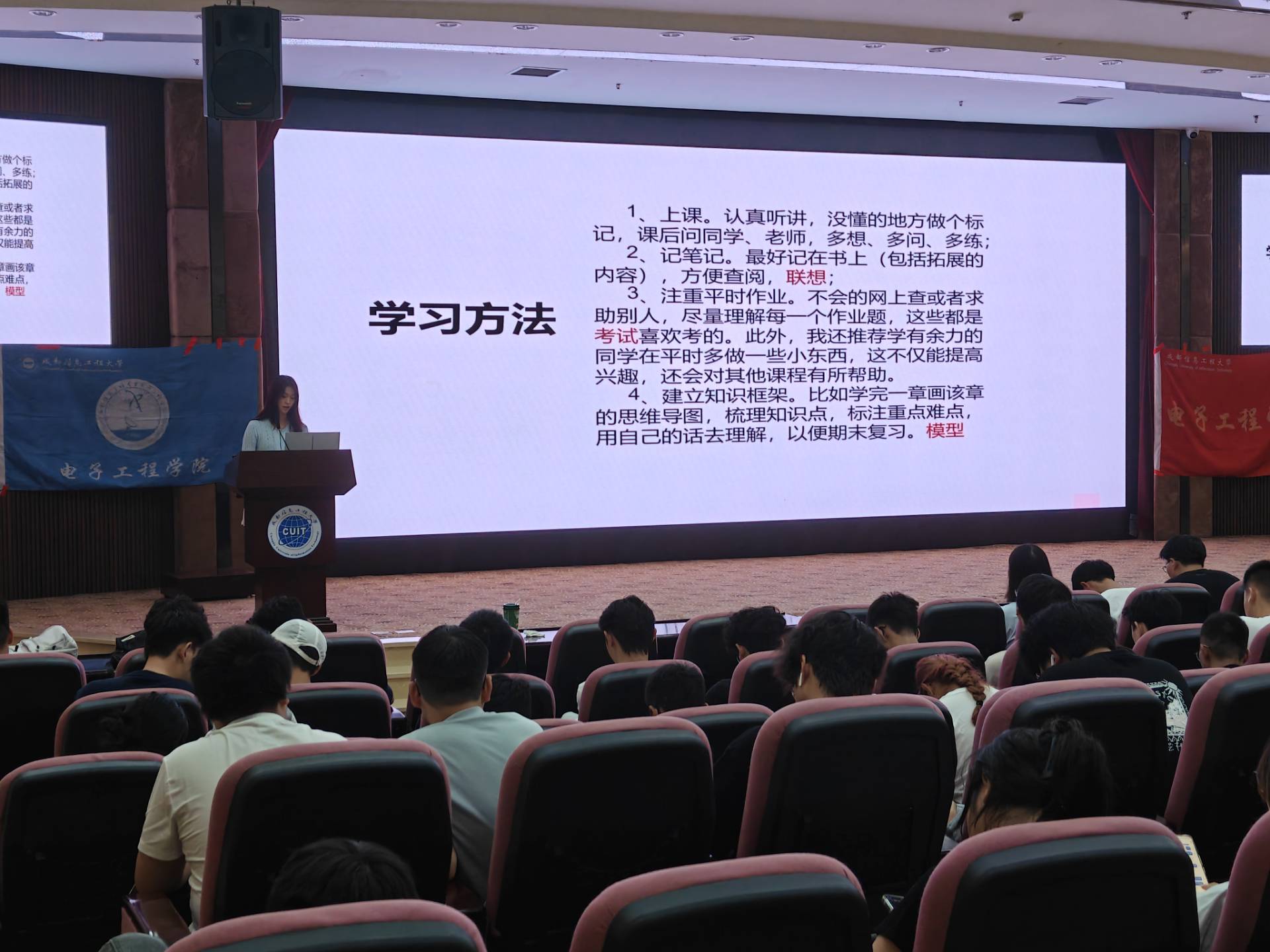 在同学们热烈的掌声中,两场学习交流会分别于10月9号14:30,10月10号13:30顺利落幕。本次交流会紧扣学生成长需求,内容务实、指导性强,为大一大二的同学提供了多门课程的实用学习技巧。通过此次经验的分享与传承,同学们必将以更加饱满的热情投入到学习生活中,乘风破浪,砥砺前行,在成都信息工程大学的广阔舞台上书写属于自己的精彩篇章。