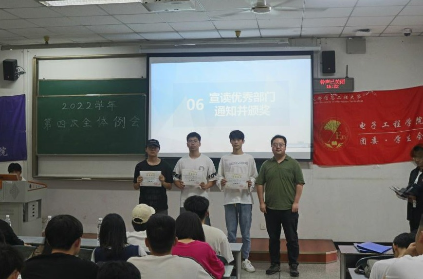然后,大会表扬了优秀部门并且为他们颁发了奖状,他们分别是:团委办公室、宣传与媒体中心、青年志愿者协会电子分会、活动部、督导部。我们感谢这些部门的成员为部门的所有付出。此后,大会表扬了优秀个人,这其中包括执行主席欧阳功铭学长,朱辛学姐等部门负责人和王子恒等干事。最后,由周意超老师致辞,为团委•学生会今年的总体工作和此次全体例会做了全面总结。