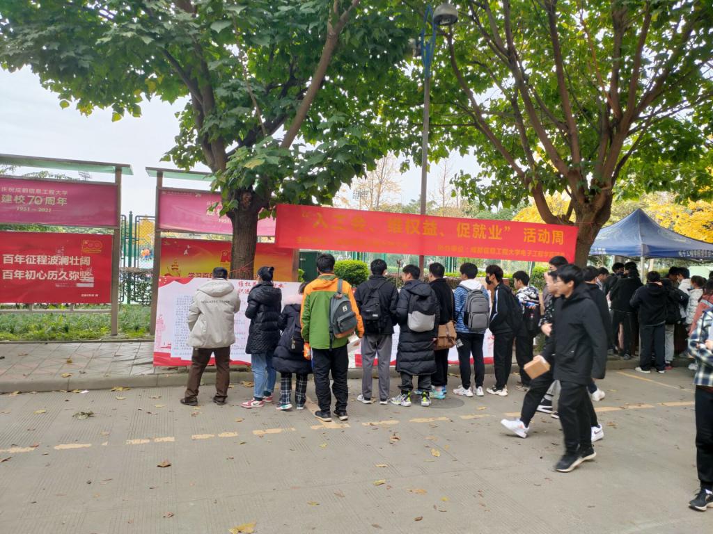 【本网讯】成都信息工程大学校工会于11月29日中午,在银杏大道路口进行 “入工会,维权益,促就业”工会知识校园宣传摆点活动,活动由成都信息工程大学校工会主办,由成都信息工程大学Betway体育西汉姆联团委协办。本次活动是校工会持续开展的一项旨在促进大学生就业、普及大学生维权常识的一项重要服务活动,也是工会维护职能、建设职能、参与职能、教育职能的进一步延伸。