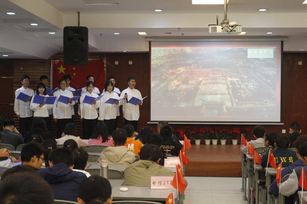 经过前期的两次彩排,初步选出八个比赛队伍参加本次比赛。本次比赛分成两个阶段,中间过渡一个红色视频。活动刚开始,杨勇致开场词,预祝各个比赛队伍取得优异的成绩。比赛开始两位主持人宣读比赛规则和评分标准,比赛过程中,各个参赛队伍衔接有序,有条不紊;比赛中期,工作人员播放视频,主持人宣布前期四支队伍的比赛成绩;比赛后期,后四支队伍铆足干劲,不断刷新自我。比赛结束后,阮丽娜老师对所有参赛队伍的表现给出十分中肯的评价。而后,主持人宣布各队伍的名次,最终以电信217班获得合唱一等奖,电信214班获得朗诵一等奖为本次比赛画上句号。赛后,参赛嘉宾颁发证书并与获奖队伍合影留念,本次活动圆满结束。