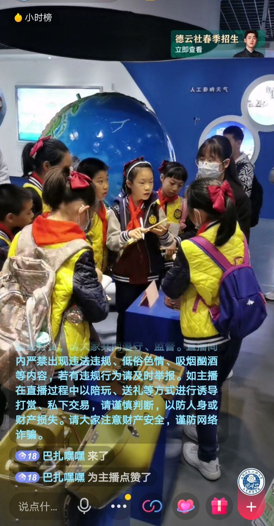在3.23气象日,我校气象科技(普)文化园区迎来了一批可爱的小朋友们。气象科普(科技)部的志愿者带领小朋友们有秩序地跟随气象科普讲解员进入博物馆。在博物馆门口,由讲解员带领小朋友们一起朗读博物馆的几行诗句,小朋友们情绪高昂,同时几行藏头诗不仅更进一步激发了小朋友的探究热情,也将我校的大气科学特色展现出来,也展现给正在观看直播的观众朋友们。
