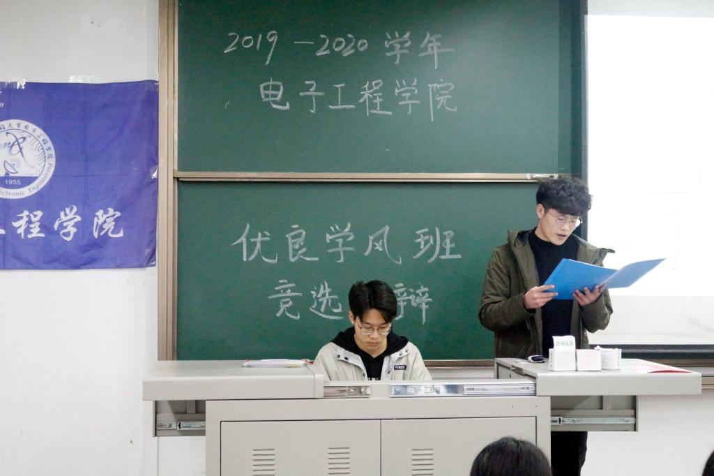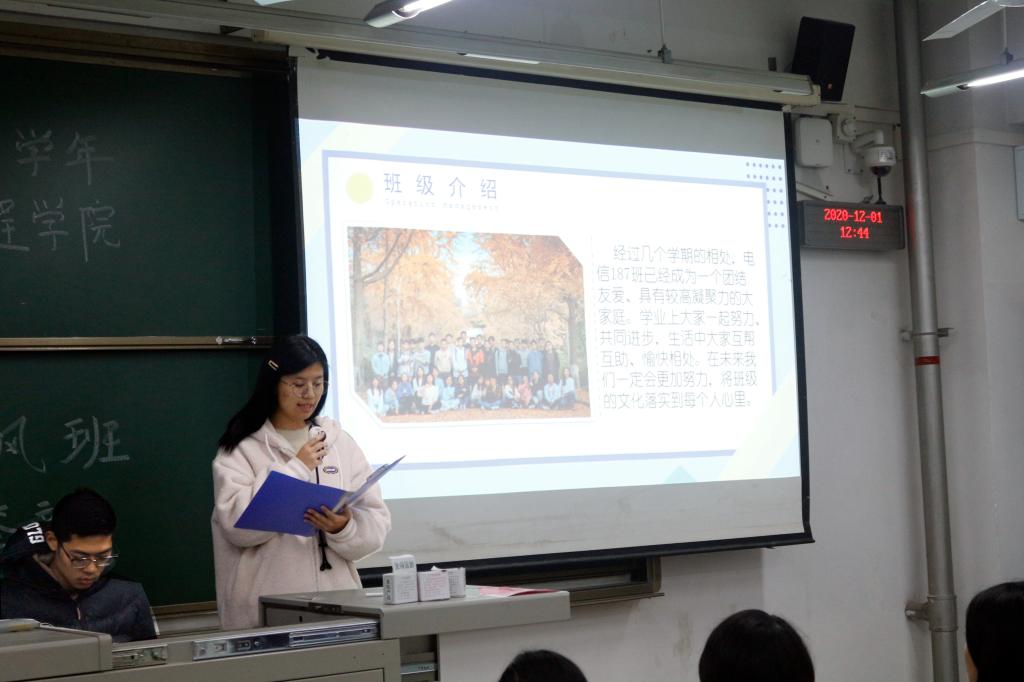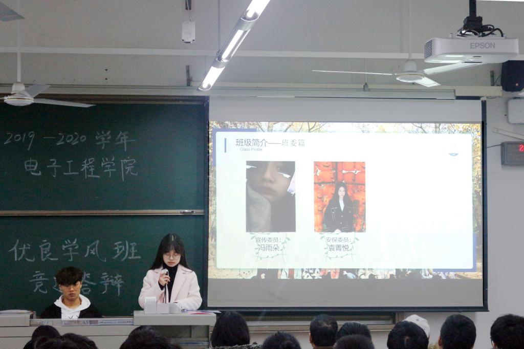参与竞选的各班代表精心制作了答辩PPT,通过照片、文字、图表、数据等形式对班级的人员概况、学习情况、挂科率、科研奖项、班级学风建设、开展活动情况等各方面进行了陈述和展示。尤其是电子信息工程187班、电子信息工程198班、电子信息科学与技术192班在整个答辩过程中表现良好,吐词清晰,展现了优秀的班级风貌。