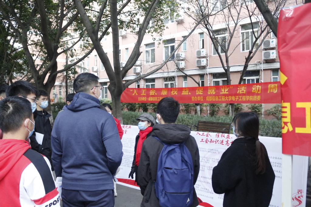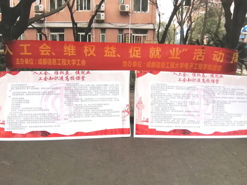 【本网讯】11月23日下午16:00时,“入工会,维权益,促就业”工会知识校园宣传活动在一食堂外进行。活动由成都信息工程大学工会主办,由成都信息工程大学Betway体育西汉姆联团委协办。本次活动是校工会持续开展的一项旨在促进大学生就业、普及大学生维权常识的一项重要服务活动,也是工会维护职能、建设职能、参与职能、教育职能的进一步延伸。