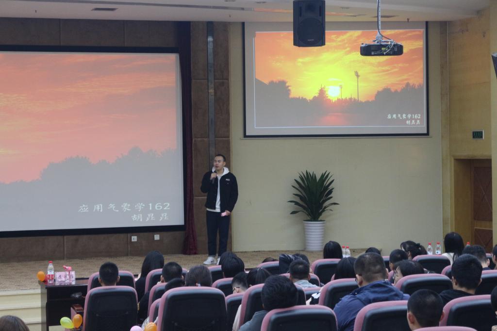主持人致开场辞后,活动正式拉开帷幕,选手开始个人的作品展示。现场的评委和观众都被一幅幅生动形象的照片所吸引,欣赏了各位选手巧妙的构图和拍摄技术,感受到了图片中蕴含的人生哲理。选手讲述了自己拍摄照片的心境以及故事,选手邵丹的作品《观梦》更是获得了评委的一致好评。作品展示结束后,周意超老师对选手的作品一一进行了点评,给选手们提出了建议,选手和观众都受益匪浅。比赛中播放的两个视频,让在场的同学们学习到了不少气象知识“云存在的最高海拔是多少千米?”“太阳光是如何促使水分蒸发的?”在气象光影变幻中感受到了气象的美好,了解到了气象知识的重要性,引起了同学们对云图、 气象的兴趣。