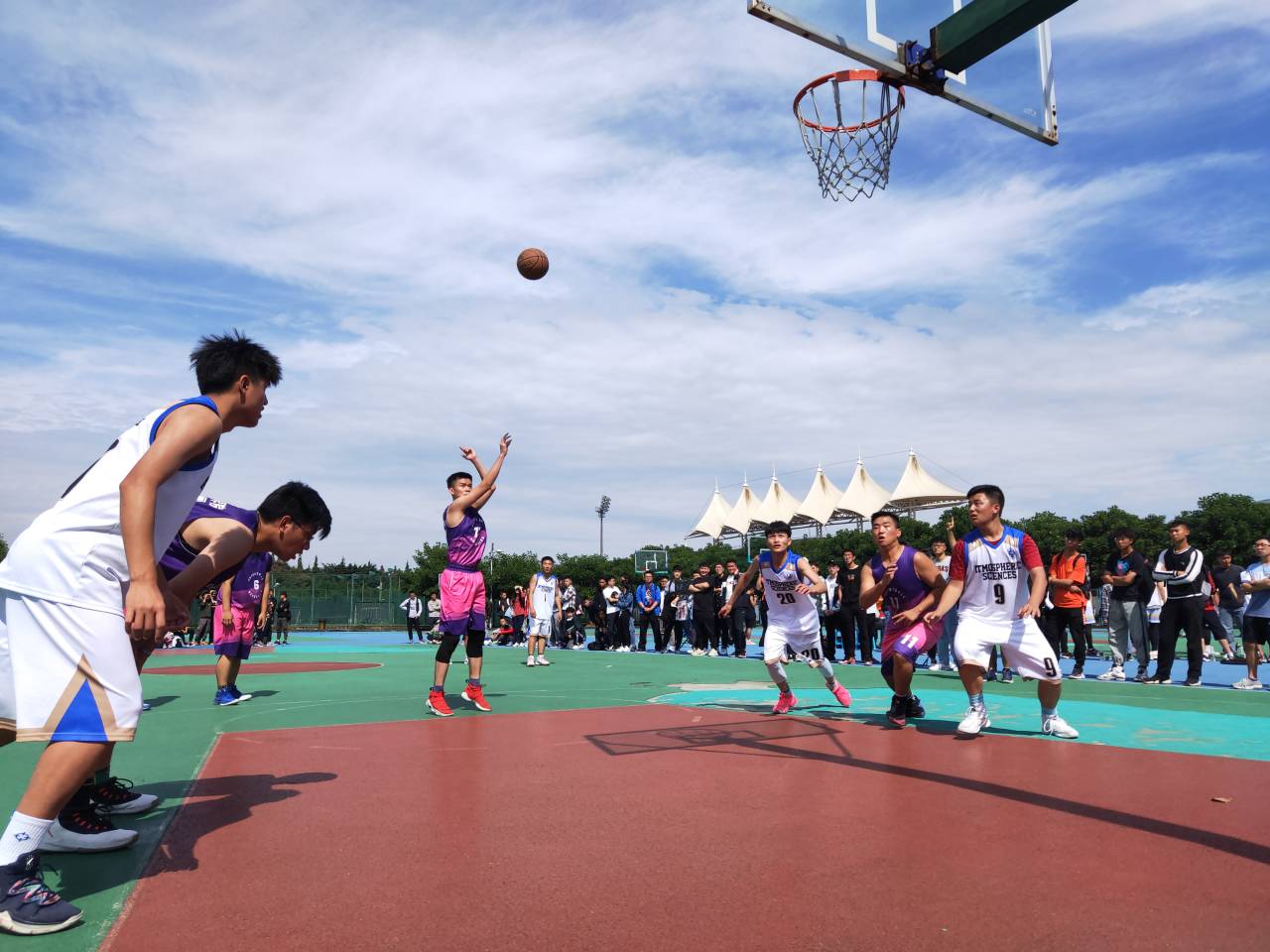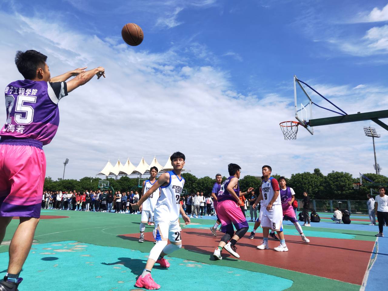 12:30准时一声哨响,比赛开始了!上半场一开始球员们迅速进入状态,尤其是大气队来势凶猛,连续抢球拿分打出开场的6:0,面对如此凶猛的大气,电子的发挥受到了影响,好在电子4号球员稳住一个两分球,气势直线上涨,一波反攻直逼大气。电子11号球员趁防备镂空,带球直冲篮下,但大气的9号球员立马截断,连续的传球,上篮,中投,比分逐渐拉开,形成压倒性优势。中场休息时双方教练及时与队员沟通,改变战术,双方换人让比赛氛围愈发紧张,进攻防守不断演变,球场里选手你追我赶,每一次的进球,都让观众为他们鼓掌呐喊。