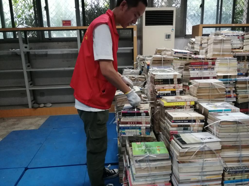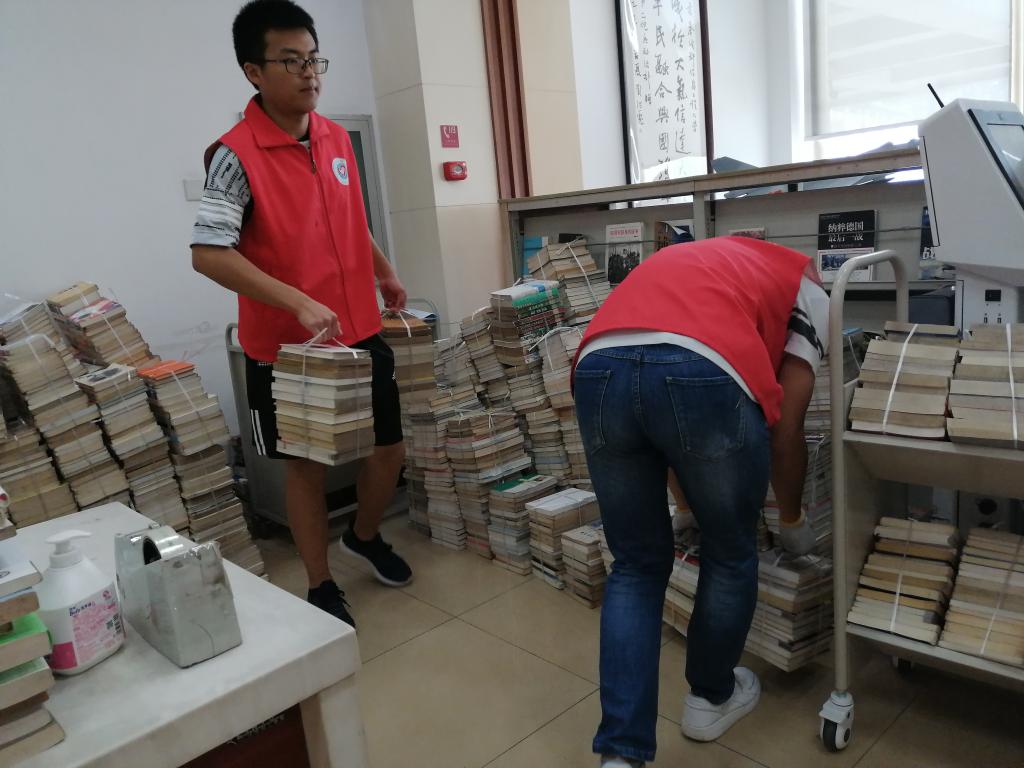 在活动中,志愿者们不辞辛劳,跟着图书馆的老师将旧书籍搬运至图书保管室,并将旧书籍进行分类摆放。在整理书籍的过程中,志愿者们合作默契,先将旧书籍用绳子捆绑打包好,再从楼上将旧书籍搬运至负一楼图书保管室。经过志愿者们一个半小时的努力,堆成小山的书籍被整整齐齐的摆放在了负一楼图书保管室里,既方便了同学们查找书籍,也为新书籍腾出了空间。
