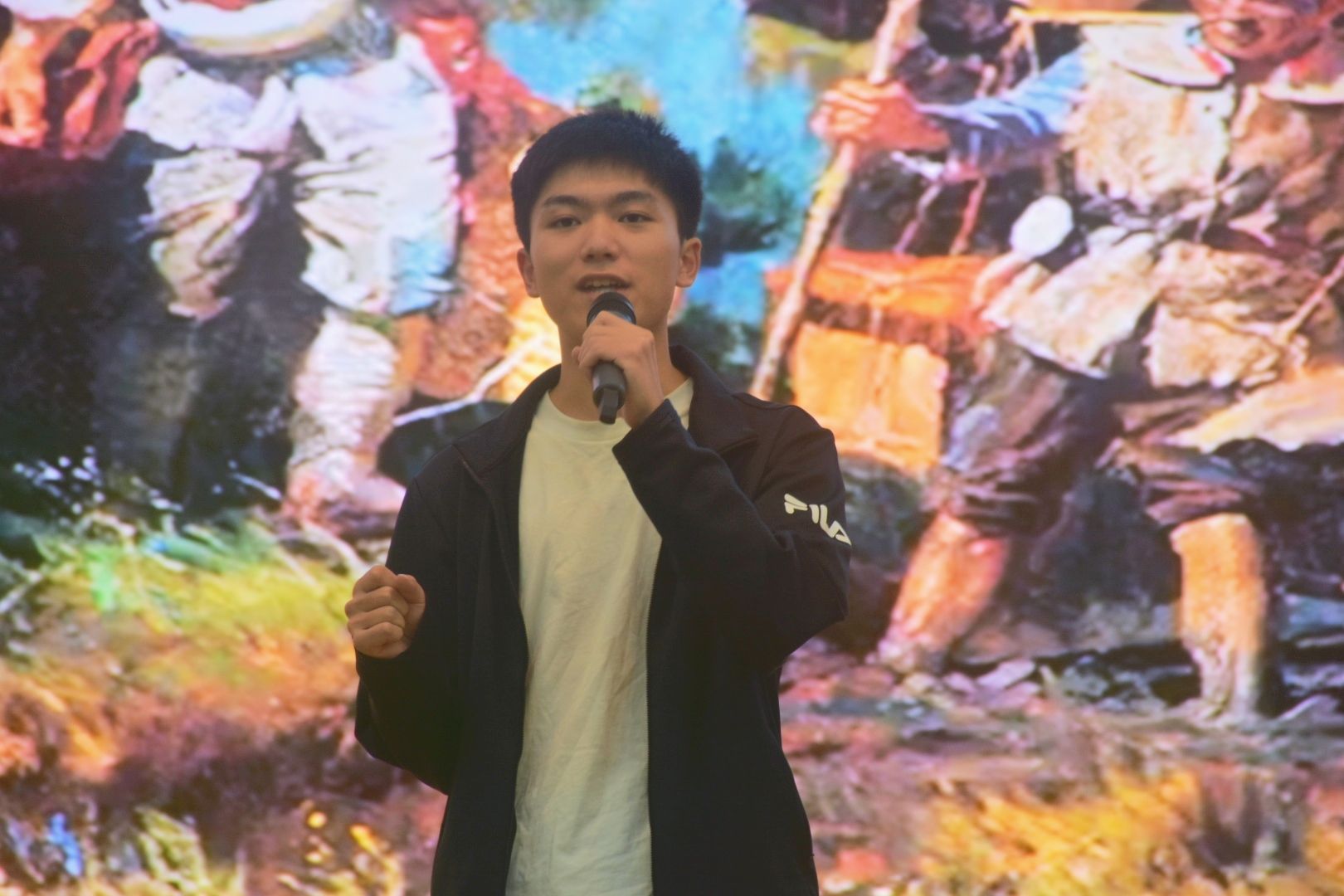 紧接着的是主持人宣读比赛规则和评分标准,过渡一个视频后,比赛正式开始。上半场先由三位演讲选手和三支红诗红歌队伍进行节目展示,节目有条不紊地进行着,表演者声情并茂,震撼全场。