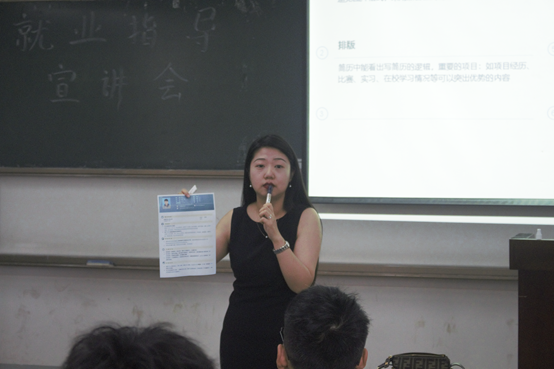 首先,张经理从简历方面,就如何快速脱颖而出,赢得面试机会为同学们进行了详细的介绍,并从人力资源经理的角度,和同学们分享了关于制作精美简历的经验,期间,和在场同学进行了互动,给同学们提出了宝贵的建议,解答了同学们的疑惑。再从面试官的角度,交流了面试官在面试时的参考维度,即价值取向、匹配度、稳定度、成长潜力、综合能力五个方面。最后,周老师为同学们解答了三方协议、毕业生户口档案派遣等一系列毕业相关问题。