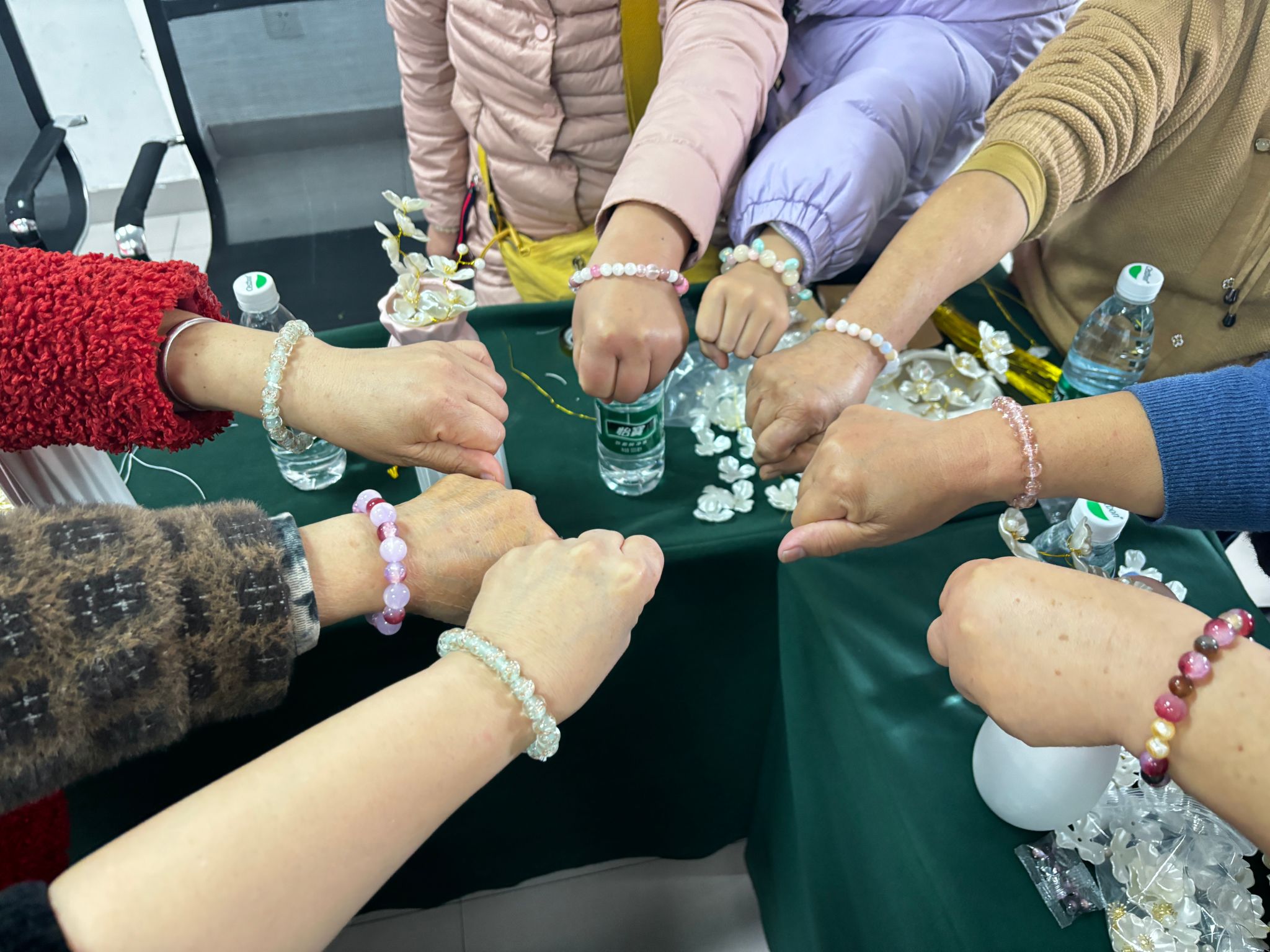 活动尾声,居民们手捧自己精心制作的、独一无二的珠花作品,脸上无不洋溢着自豪与喜悦的笑容,大家共同合影,记录下这美好的瞬间。值得一提的是,11月13日在近都社区的首场活动还特别增设了手链编织环节,五彩丝线在指尖飞舞,编织出对美好生活的热爱与追求。