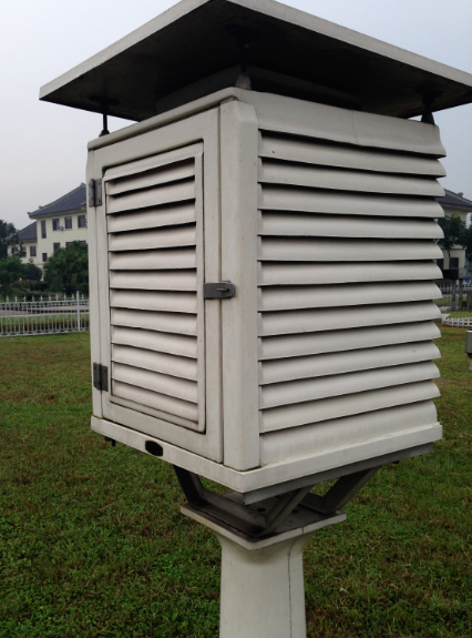 气象百叶箱通常由木质和玻璃钢两种材料制成,箱壁两排叶片与水平面的夹角约为45°,呈“人”字形,箱底为中间一块稍高的三块平板,箱顶为两层平板,上层稍向后倾斜。玻璃钢百叶箱内部高615mm、宽470mm、深465mm。用于安装各种温、湿度测量仪器。白色的,不容易吸热。如果装在封闭的箱子中,就没有办法准确测量当时外界的温度;如果露天的话由于太阳直接照射又会造成温差,下雨的话又会对温度计造成损坏。