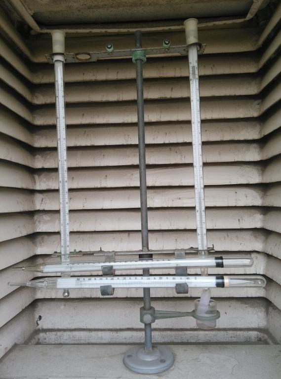 最低温度表是测定一定时段内最低温度的温度表。表中装的是酒精,酒精柱中有一活动指标,降温时酒精收缩,因酒精的表面张力把指标带下;升温时,酒精从指标与管壁的缝隙处上涨,而指标留在原处。指标远离球部一端的示度即为该时段内的最低温度。观测后稍抬高温度表球部,使指标滑到酒精柱顶端,待下次观测。