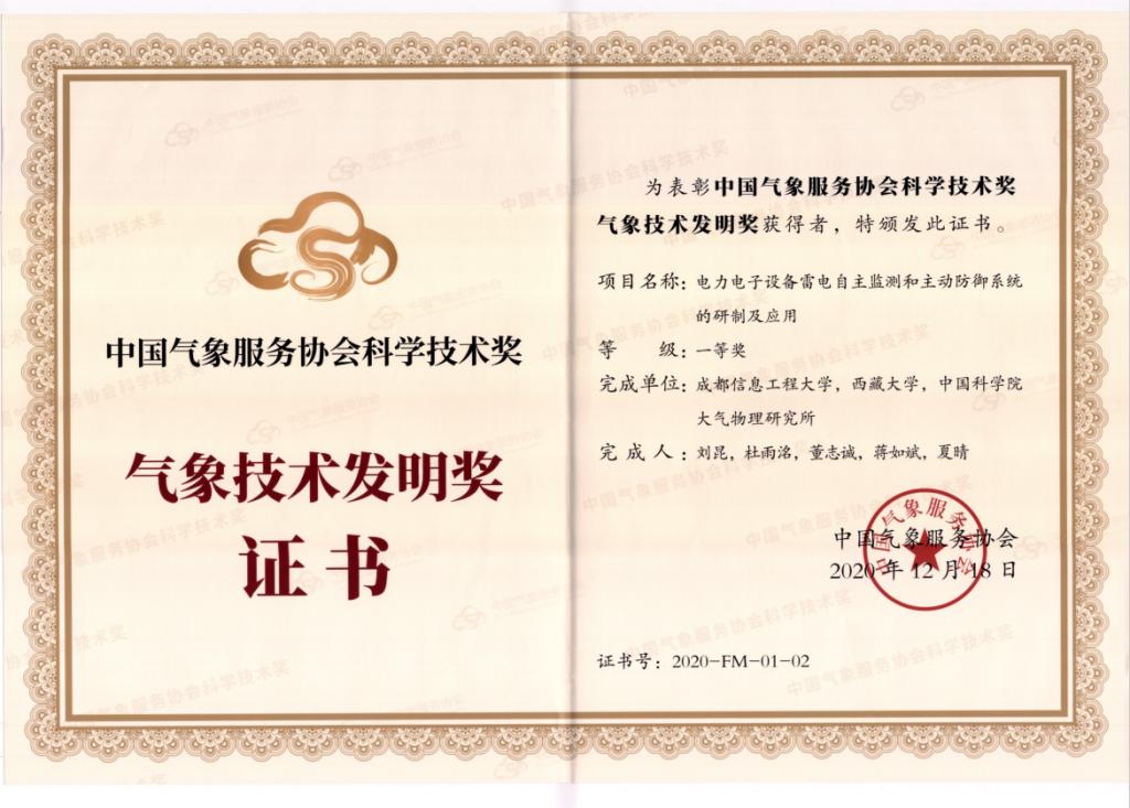 12月18日上午,中国气象服务协会2020年会暨第二届气象产业(中国气象谷)发展大会在南京信息工程大学召开。重点开放实验室刘昆教授团队主持完成的“电力电子设备雷电自主监测和主动防御系统的研制及应用”获得中国气象服务协会科学技术奖气象技术发明奖一等奖。