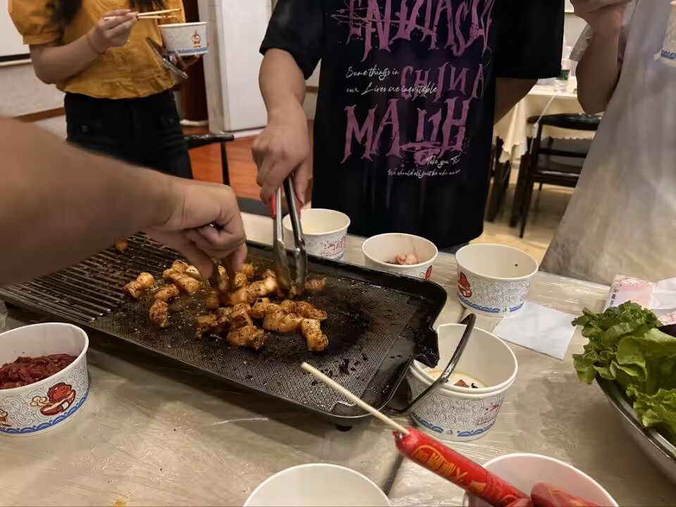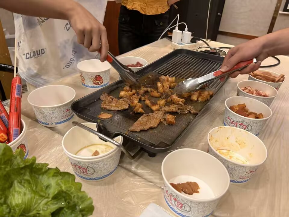 厨艺展示:烧烤架上烟熏火燎,火锅里翻滚着各种美味,我们的大厨们各显神通。